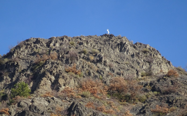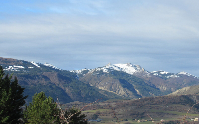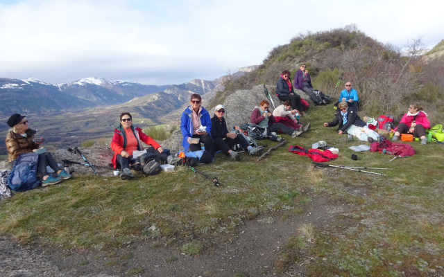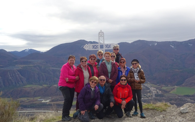 Au dessus du village, un agréable sentier, de montées en descentes, nous hisse jusqu’à la Sainte Croix (1053m). Nous bénéficions alors d’un incroyable panorama sur la vallée de la Durance et les montagnes enneigées alentour. Au loin vers l’ouest, par temps très clair, nous aurions pu apercevoir le Mont Ventoux.