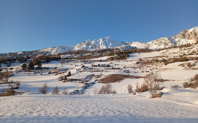 Pas de problème d’orientation, la trace est bien marquée. Nous arrivons au Clot Chaud, d’où nous découvrons un beau panorama sur le Lac de Serre-Ponçon dominé par le Grand Morgon, le sommet de Dormillouse, à l’ouest, le soleil couchant embrase la neige derrière Céüse.