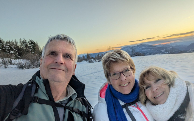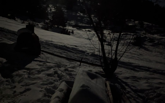 Nous traversons ensuite le hameau d’alpage du Forest des Barthiers, endormi sous la neige. La lune n’est toujours pas là, le soleil, lassé de l’attendre est définitivement parti se coucher. Nous allumons nos frontales. Lorsque nous arrivons au Jardin des Gardes, enfin la star de la soirée daigne se montrer. D’abord timidement, un peu caché derrière une crête, et un peu dans les nuages. Et finalement, faisant fi de sa timidité, elle se montre dans toute sa splendeur. Nous descendons jusqu’au « château » de la mère de Yoyo pour faire une petite pause. Apéritif aux fleurs de sureau, boissons chaudes, gâteaux…
