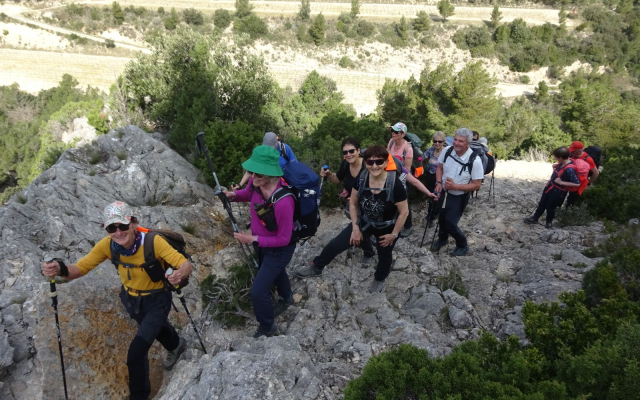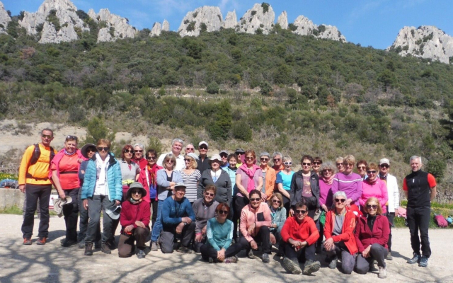 Suite à ce court mais agréable moment de repos, nous partons à l’assaut des Dentelles Sarrasines. La reprise est dure après le repas et la montée est raide et technique, mais cela en valait la peine. En haut le spectacle est magique avec vue sur les Dentelles du Grand Travers et la crête de Saint Amand sur la commune de Suzette. La descente en boucle, également technique, requiert toute notre attention. Une grande trouée creusée dans les Dentelles puis une plus petite, nous offrent un spot pour des photos inédites, le mont Ventoux enneigé au loin également. De beaux ibéris blancs des rochers relèvent fièrement leurs têtes. On arrive au col du Cayron, une route tranquille puis un ultime petit sentier pentu, nous ramène à Lafare où la fontaine nous permet de nous rafraîchir et remplir nos gourdes. Bientôt nous rejoignons le parking, où le car nous attend,. Nous sommes dans les temps…