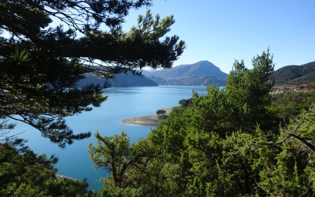 La descente s’effectue un instant dans la forêt puis après un plateau herbeux, nous poursuivons à flanc de montagne, dans un paysage de marnes grises.Tout en bas, dans la Baie des Moulettes, le viaduc semble plonger dans le lac.