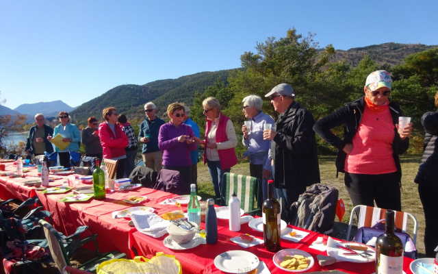La fin de la balade se précise, nous arrivons en bordure du lac, sur une aire aménagée pour accueillir les pique-niques. Madeleine et Marc nous y attendent. Les braises sont prêtes pour faire fondre les camemberts et réchauffer les pommes de terre. Comble du luxe ,Madeleine a dressé et fleuri une immense table, Colette y a déposé des choux apéritifs. Un régal des yeux et des papilles. L’apéritif arrosé du bourru de Valserres et le copieux repas (pommes de terre, camemberts ,tartes, raisin, mandarines) se déroulent comme d’habitude dans une ambiance amicale et chaleureuse.